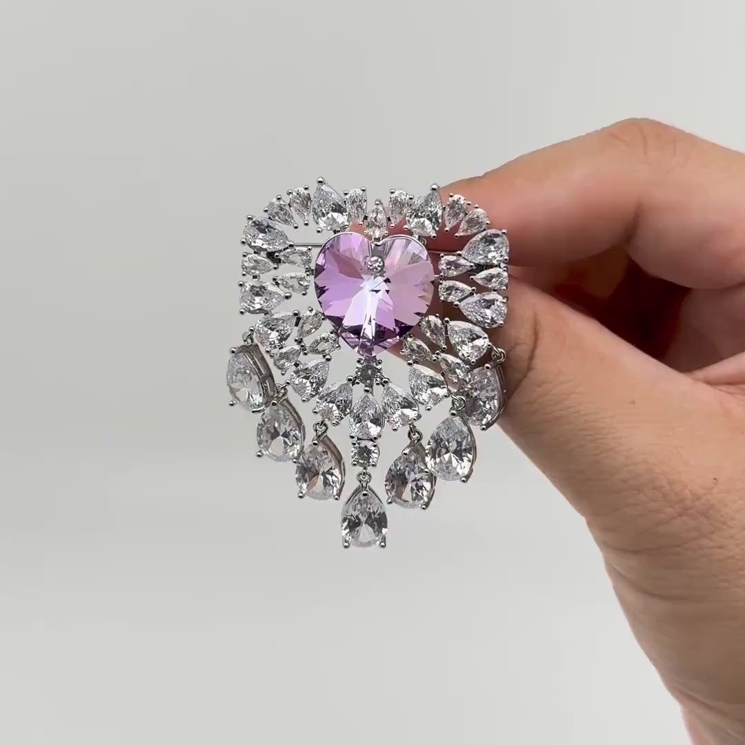 A luxurious heart-shaped brooch that doubles as a pendant, crafted with Austrian crystals and zircon for intense sparkle. At 55 mm by 41 mm and weighing approximately 25 g, it sits comfortably on jackets or dresses without pulling fabric. Copper base with a gold-tone finish offers lasting colour and secures with a sturdy pin and bail for easy wear as a necklace. Supplied in a presentation gift box, it makes a memorable birthday or special-occasion present.