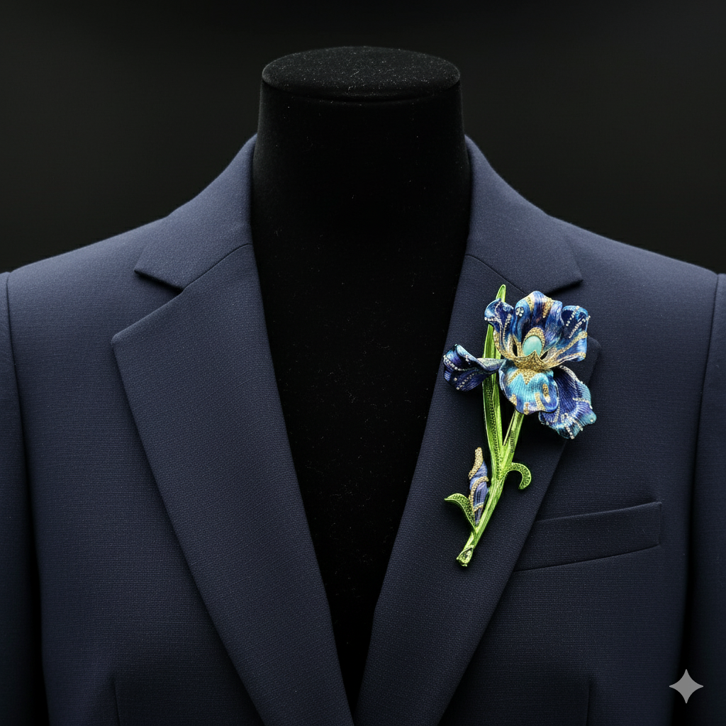 This Art Deco fleur‑de‑lis brooch combines sparkling rhinestones with vivid enamel to add vintage glamour to coats and lapels. Measuring 115 mm by 65 mm and weighing 67 g, it is substantial yet comfortable to wear. Handcrafted on a copper backing for durability, each crystal is securely set for lasting shine. Supplied in a gift box, it makes a striking present for special occasions.