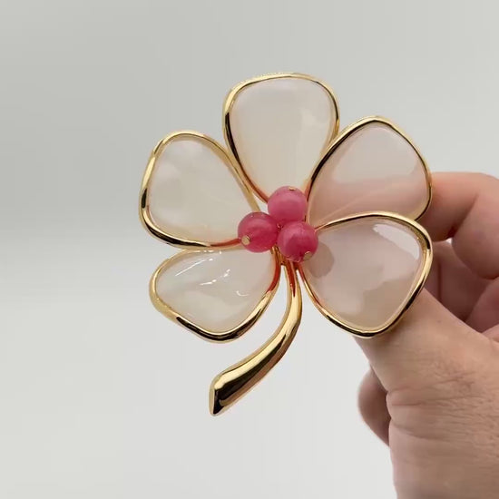 This French vintage-inspired floral brooch combines resin, stone and copper for a lightweight yet sturdy accessory. Measuring 88 mm by 73 mm and weighing approximately 55 g, it sits comfortably on jackets, scarves and hats without pulling fabric. The detailed pink stamen and textured petals add a classic, eye-catching finish to outfits and arrive in a gift box for easy presentation. Each handmade piece varies slightly in colour and pattern, giving it authentic character.