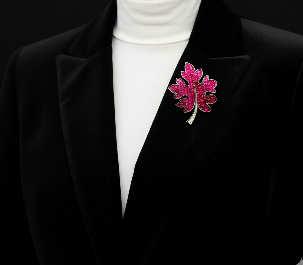 A sparkling maple leaf brooch crafted from rhinestones, crystal and copper for a refined suit accessory. Measures approximately 60 mm by 50–58 mm and weighs 18–21 g, offering a comfortable, secure fit. Handmade finish with a reliable pin fastening and presented in a gift box for easy gifting. Ideal for formal wear, special occasions or as a thoughtful keepsake.
