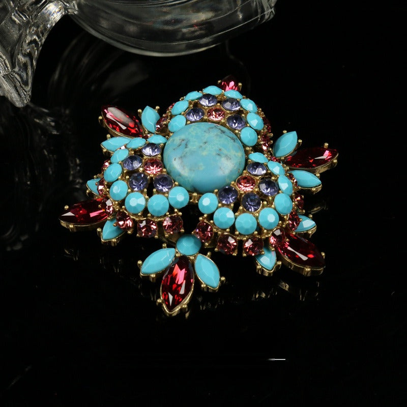 Turquoise Glass Flower Brooch & Earrings Necklace Set