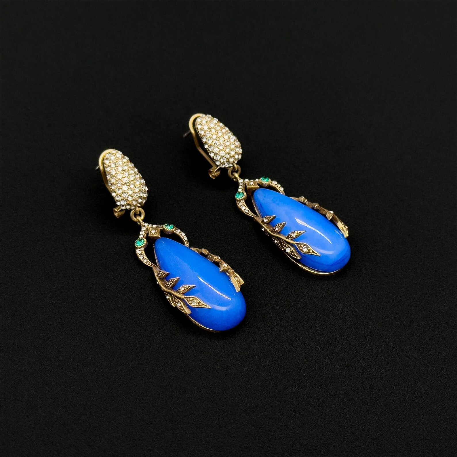 Vintage Art Deco Blue Leaf Earrings