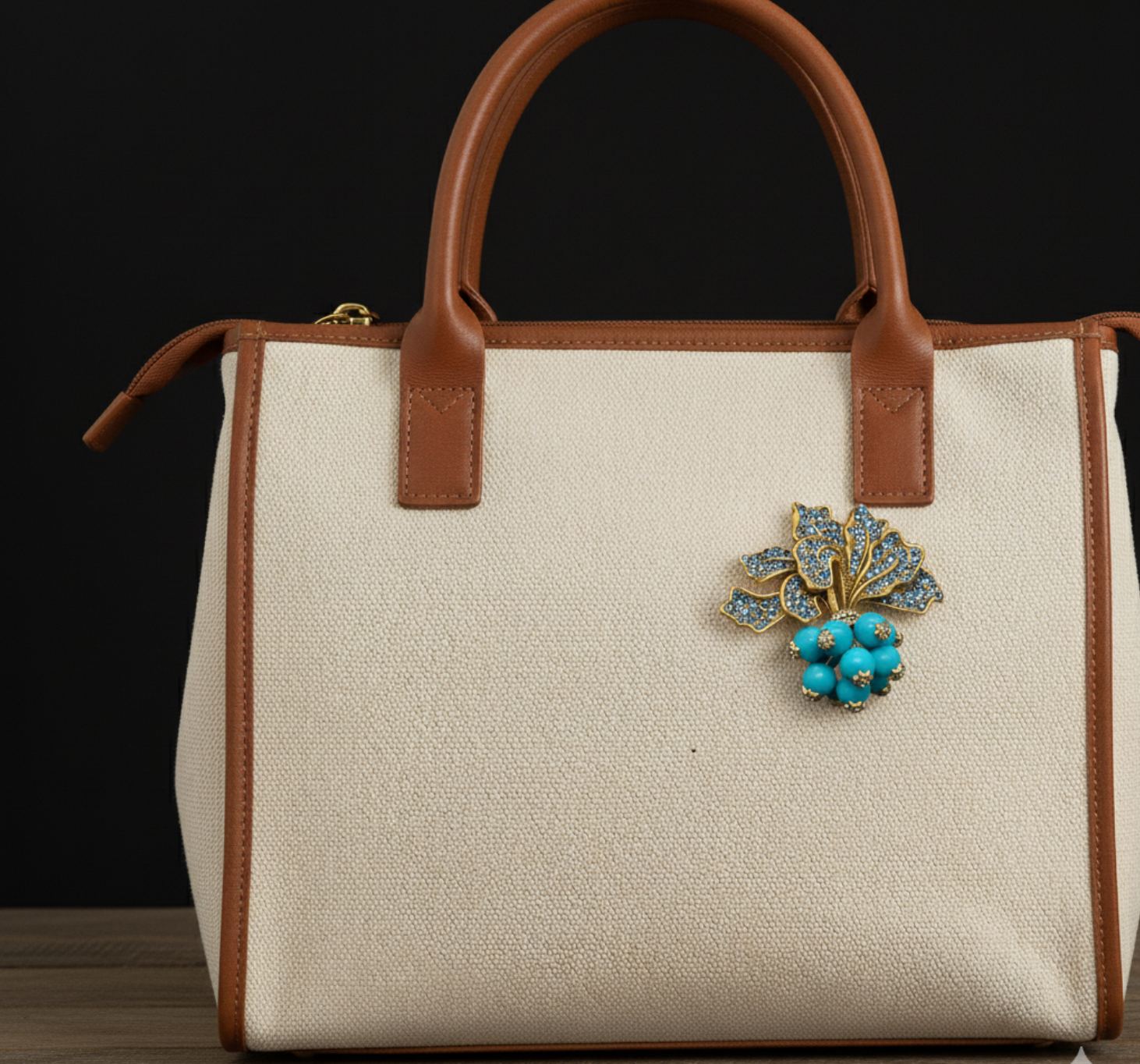 Handcrafted Art Deco brooch featuring blue crystal, glass and copper with 18K gold plating for lasting shine. Measuring 70 mm by 70 mm and weighing 68 g, it sits comfortably on coats, scarves or lapels. The three-dimensional leaf and radish motif offers a striking statement while remaining lightweight and wearable. Supplied in a gift box and dispatched from China with returns accepted.
