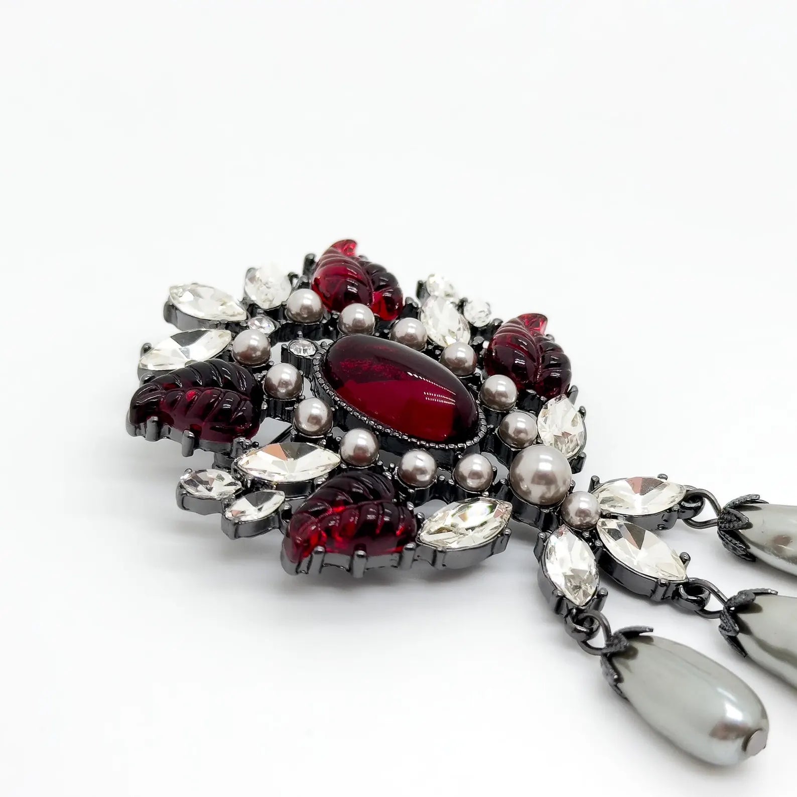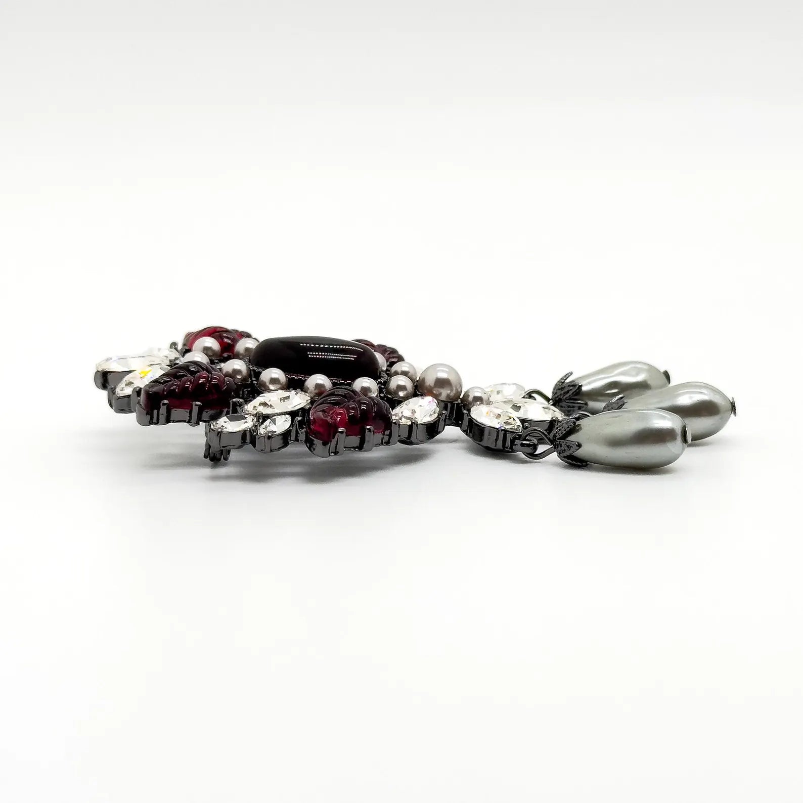 Bring elegance and sophistication to your style with this handcrafted mid-century brooch. Made with glass (Liuli), pearls, crystals, and copper, each piece showcases exquisite craftsmanship and vintage charm. Perfect for accessorizing jackets, dresses, scarves, or bags.